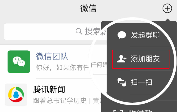 打開微信,點(diǎn)擊右上角“+”,點(diǎn)擊“添加朋友”,粘貼微信號(hào)即可